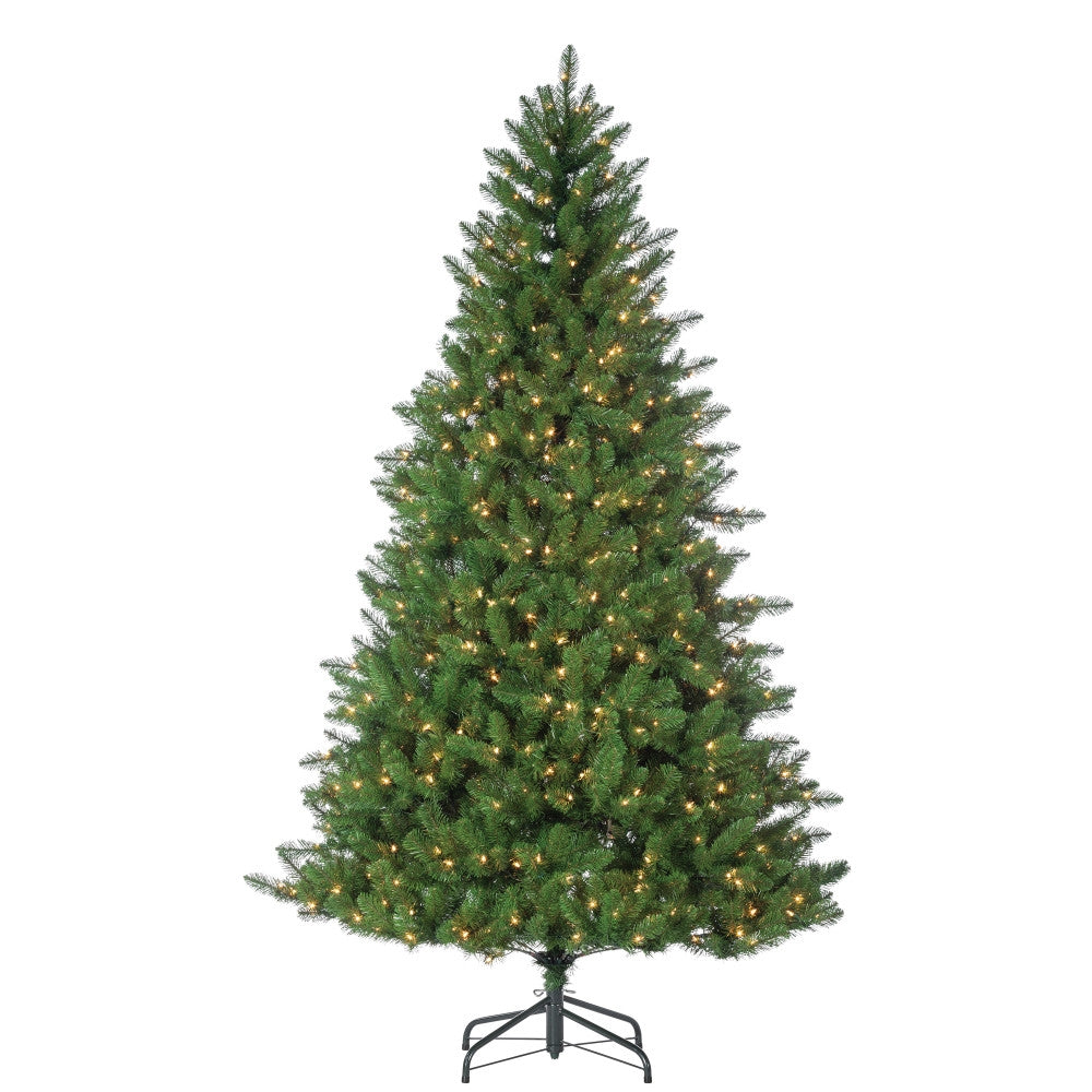 A traditional size fluffy 7.5-foot Stone Pine tree is pre-lit with warm white lights in a metal base. This pre-lit Stone Pine is powered by a UL-Listed cord for your safety. A string of 700 clear white LED lights are woven into this tree for sparkle and shine. Made from metal, wire and pvc for a sturdy and attractive home décor accent. This tree has a natural appearance with 1171 pine tips and a wide base width of 51-inch. Metal tree stand is included.