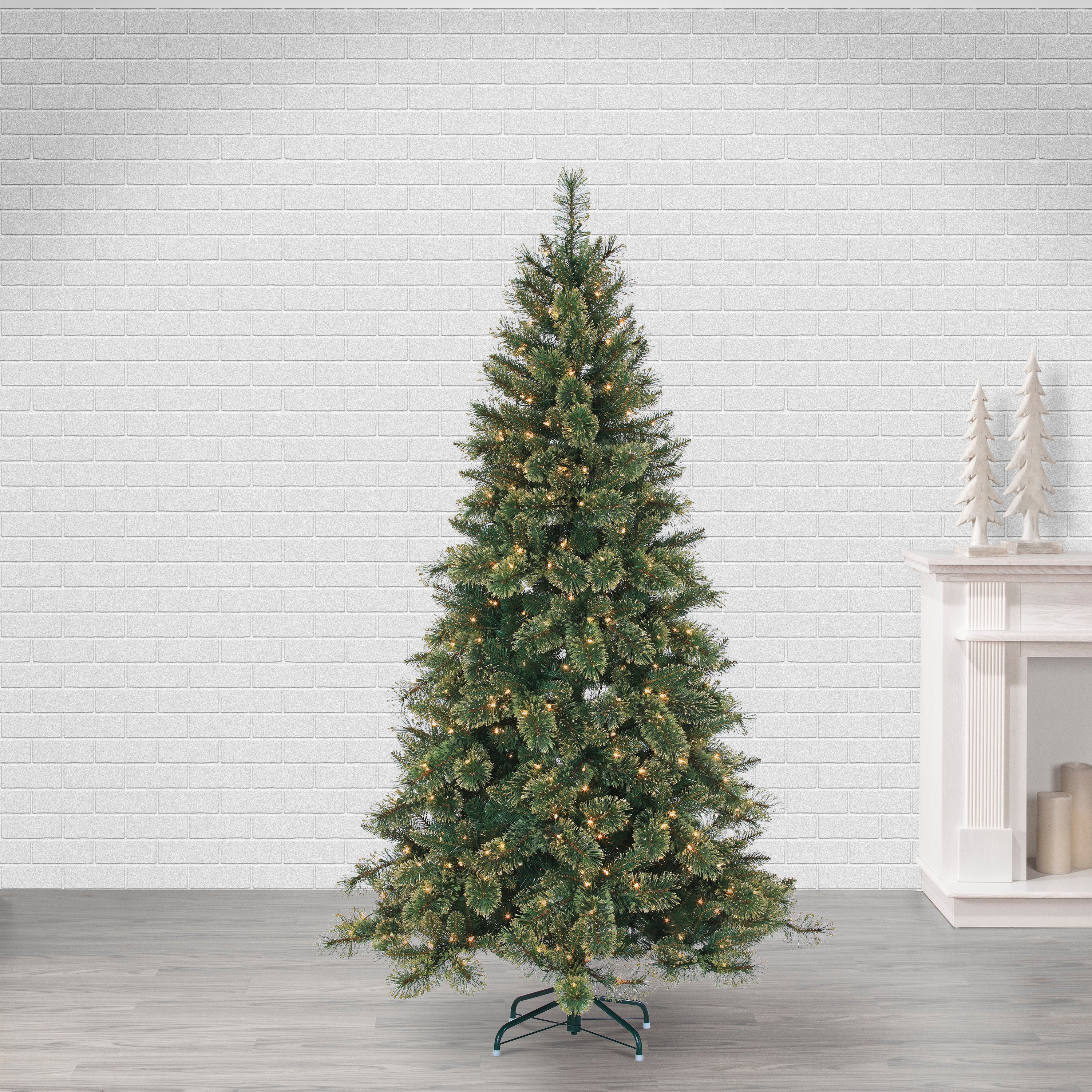Unpack your tree skirt for this wonderfully full, awe-inspiring pre-lit artificial Hard Needle Deluxe Gold Glitter Cashmere Pine Christmas tree with a natural look so realistic it could fool your gardener! At a towering 7.5-foot height with that classic, lightly iced look and a shapely base diameter of 54-inches, this stunning Pine comes with 500 clear incandescent bulbs to add a warm, hearth-and-home glow, but without the mess and fire dangers of a live-cut tree. Safe, fire-resistant needles provide an amazing 608 Pine branch tips to put your favorite ornaments on display. It’s an eye-catching centerpiece providing the cheer to make your holidays a lasting memory. Comes with a sturdy four-prong stand for safety and stability.