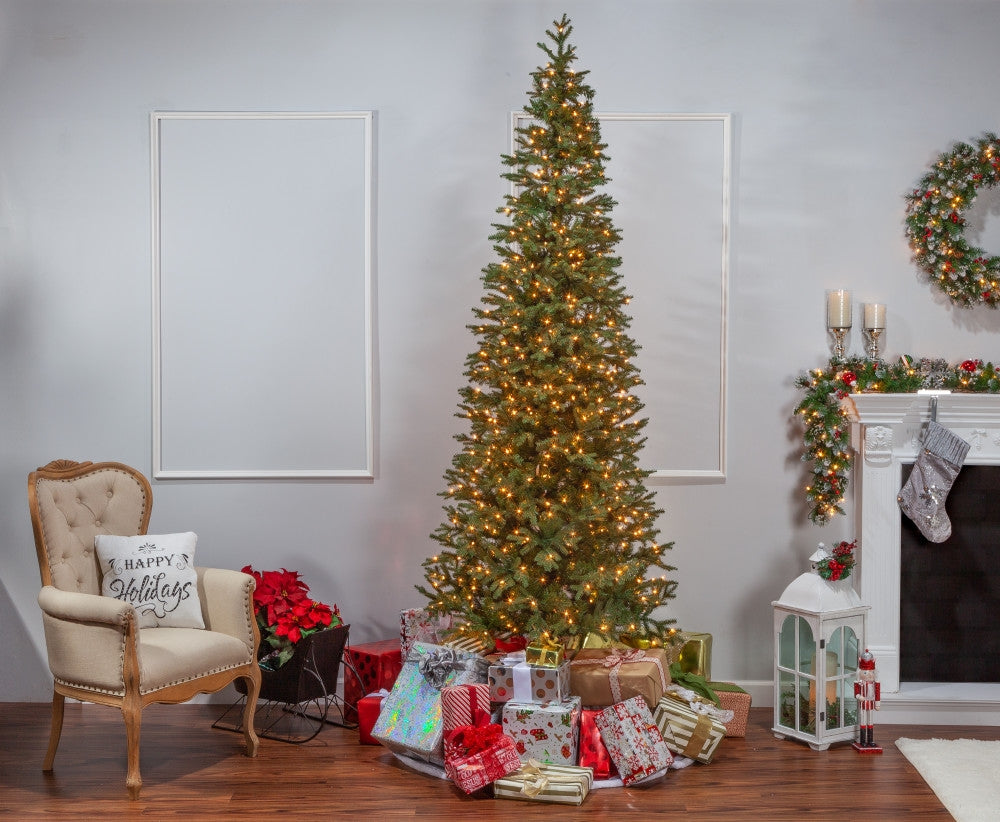A tall 9-foot tree with space saving dimensions this pre-lit Jackson Pine has narrow, but full branches and a metal baseThis pre-lit Jackson Pine is powered by a UL-Listed cord for your safetyA string of 750 clear white LED lights are woven into this tree for sparkle and shineMade from metal, wire and pvc for a sturdy and attractive home d