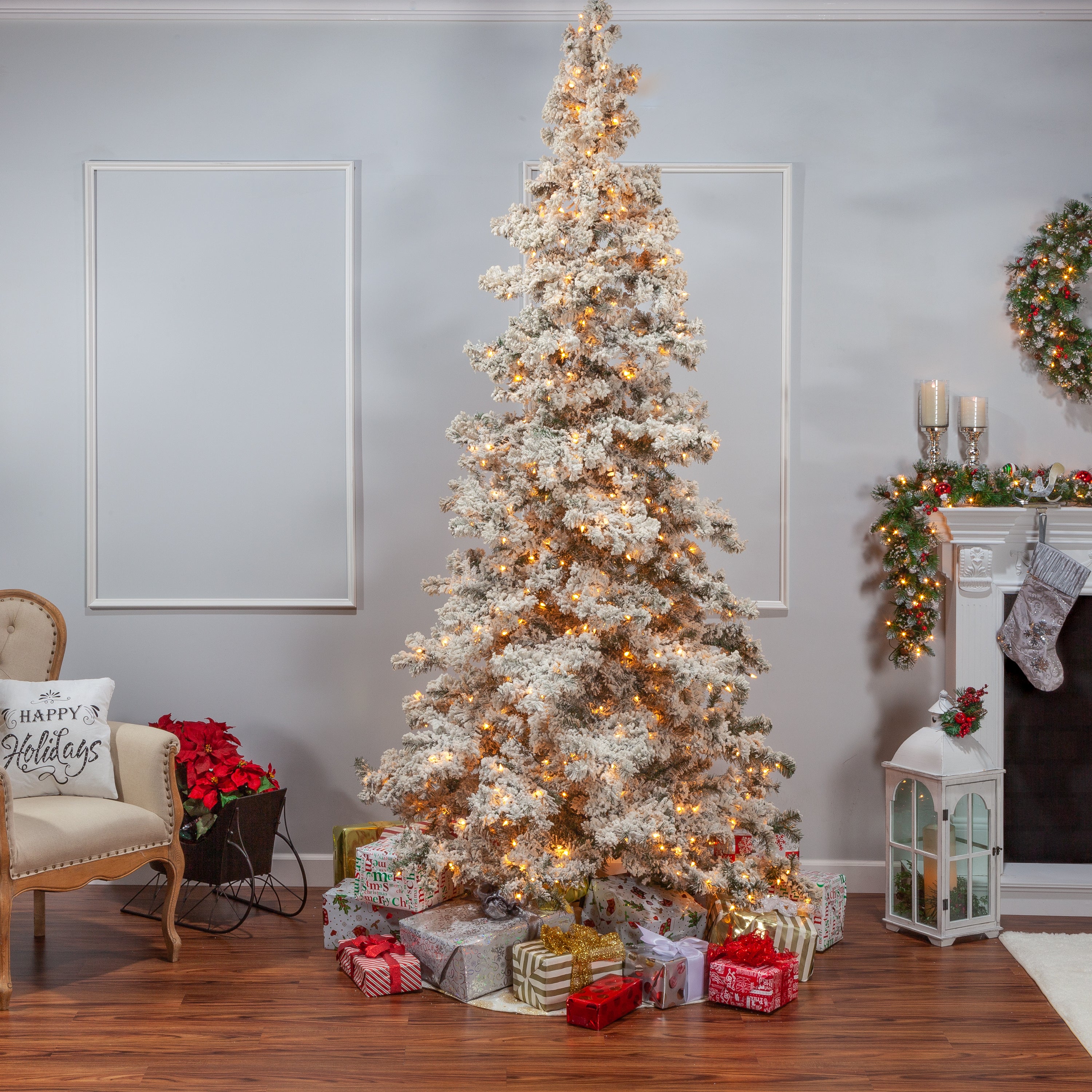 Bring the beauty of freshly fallen snow into your home for the holidays with this awe-inspiring pre-lit artificial heavy flocked layered Spruce Christmas tree! A towering 9-feet high with that classic layered look and a shapely base diameter of 62-inches, this stunning Spruce comes with 750 clear incandescent bulbs to add a warm, hearth-and-home glow, but without the mess and fire dangers of a live-cut tree. Safe, fire-resistant needles provide an amazing 1569 Spruce branch tips to put your favorite ornaments on display. It’s an eye-catching centerpiece providing the cheer to make your holidays a lasting memory. Comes with a 29-inch diameter, sturdy four-prong stand for safety and stability.