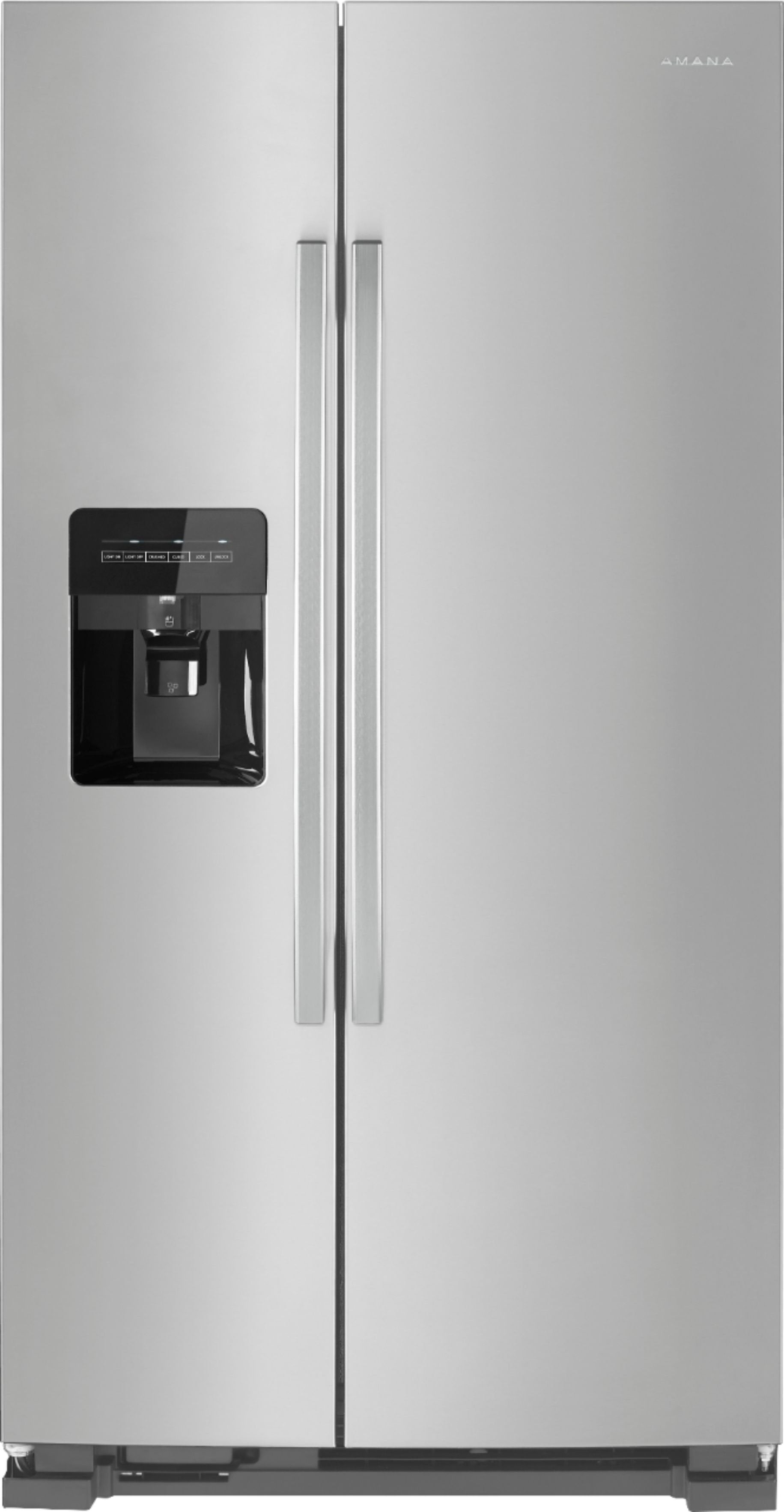 Simplify food storage with this 36-inch Amana side-by-side refrigerator. The electronic temperature controls are easy to set and the dual-pad dispenser puts water and ice at your fingertips with the need to open the door. This Amana side-by-side refrigerator has large-capacity adjustable door bins three glass shelves and two drawers for versatile grocery organization.
