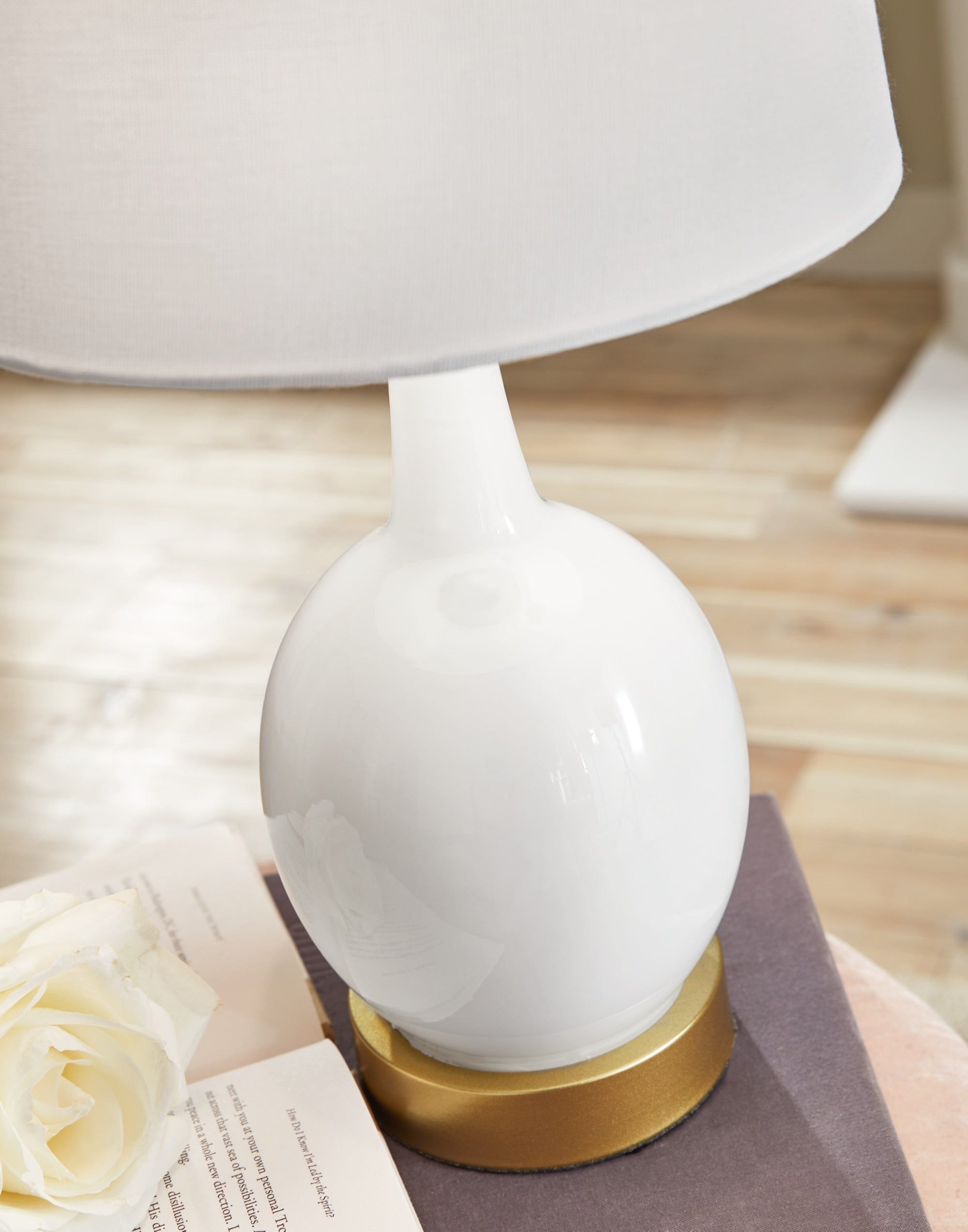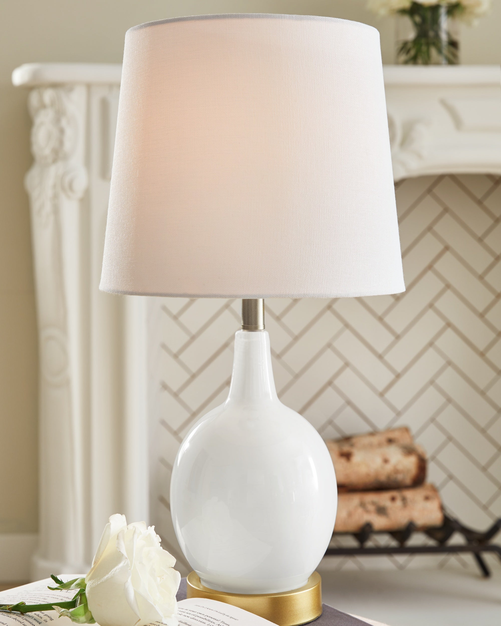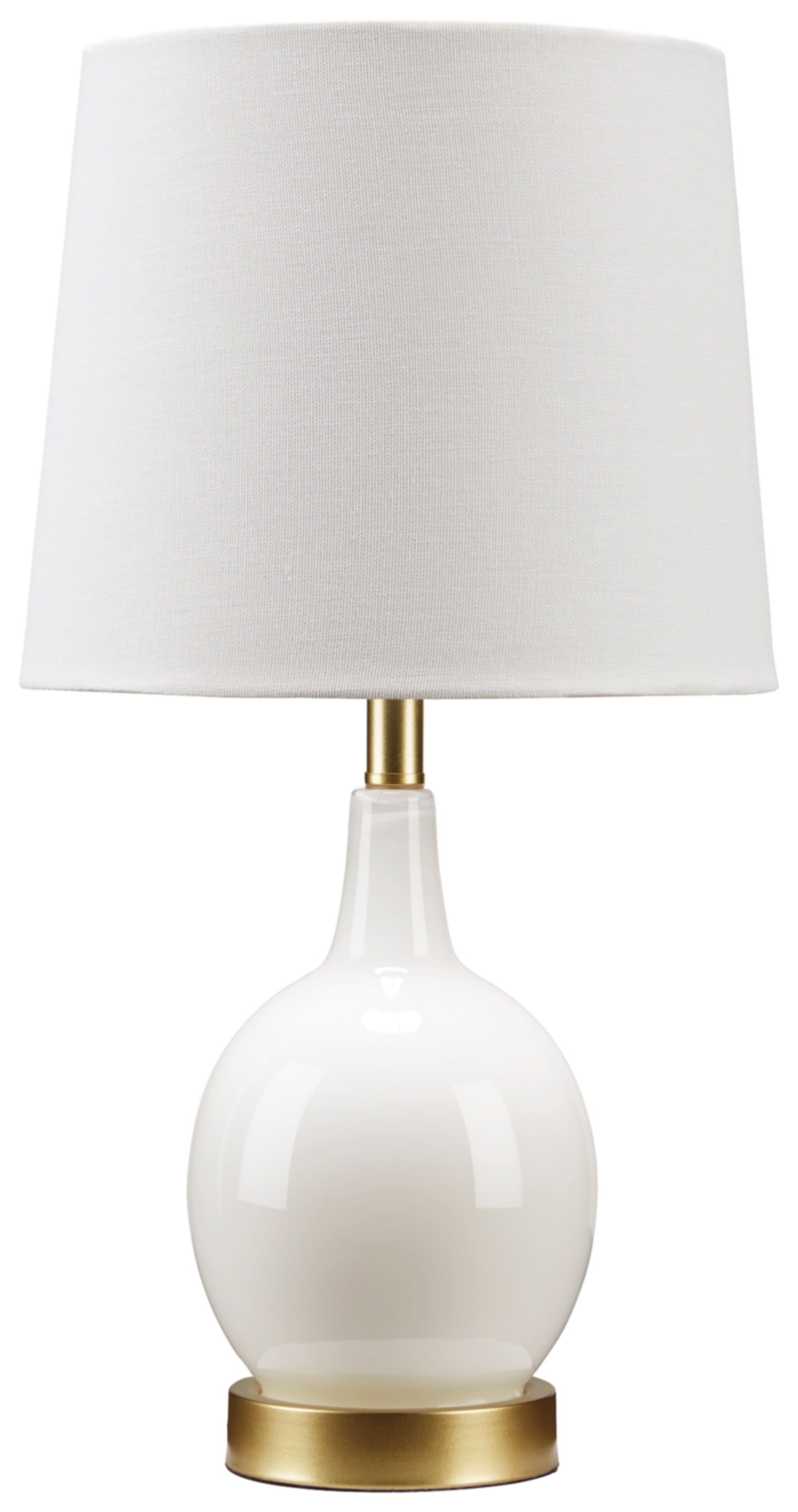 The Arlomore glass table lamp in a white finish is the perfect combination of form and function, providing lighting and chic style to any interior. The curvaceous white lamp is crafted for modern flair and is topped with a crisp, white fabric shade.