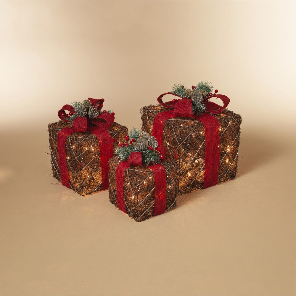 Set of 3 Electric Lighted Natural Vine Gift Boxes with Burlap Ribbon, Lg is 12"x12"x15" Md is 9"x9"x12", Sm is 6"x6"x9"