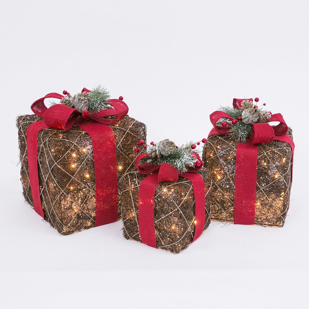 Want pretty packages under the tree? This set of 3 natural brown vine gift wrapped burlap boxes will fit the bill! Theses electric boxes light up with soft warm LED lights from light strings when turned on. The beautiful boxes come in 3 sizes and will nest together to make storage easy when not in use. Each box top is loaded with pvc pine branches, scattered red berries, and assorted-sized pinecones for that special holiday presentation. Thee special gift boxes are portable to use separately, or grouped together with other holiday decor for a beautiful elegant display in your home.
