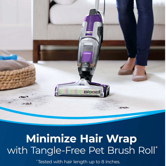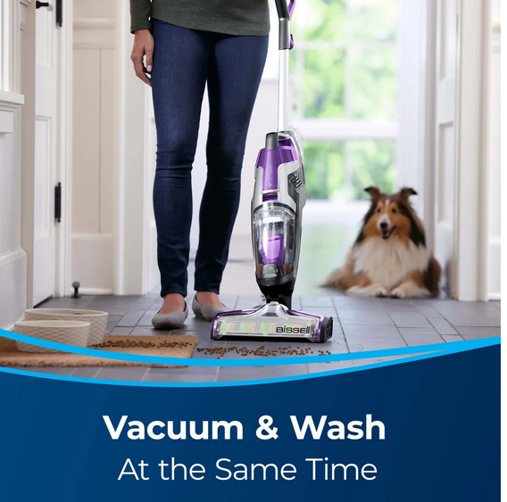 CrossWave Pet Pro vacuums and washes your everyday messes. Vacuums and washes floors at the same time and in one easy step! Cleans better than a sponge mop and bucket, and in less time. You can seamlessly switch between cleaning hard floors to area rugs by the Fingertip Controls, while delivering the right amount of formula to your floors with the On-Demand Formula Trigger. The Tangle-Free Brush Roll scrubs to remove debris and minimizes annoying pet hair wrap (Tested with hair length up to 8 inches).
