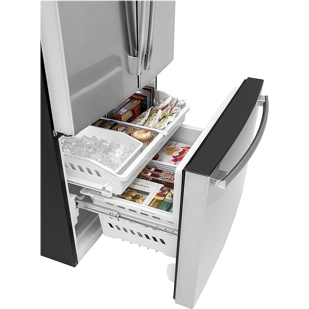 Enjoy having ample space to store large grocery loads with this GE French door bottom-mount freezer refrigerator. The spill-proof shelves keep spilled liquids from dripping onto other foods, while the Turbo Cool and Turbo Freeze settings restore interior to a set temperature for optimum food freshness. Quickly cool warm drinks with ice from the automatic icemaker installed in this GE French door bottom-mount freezer refrigerator.
