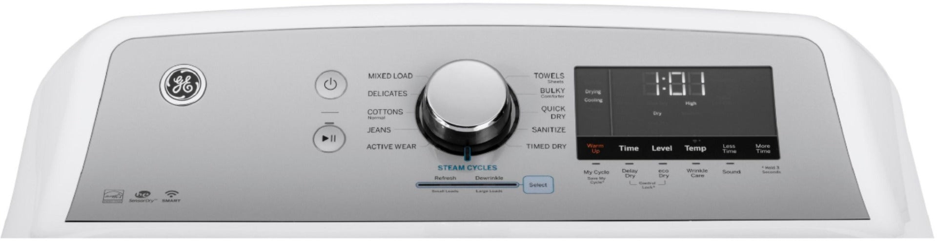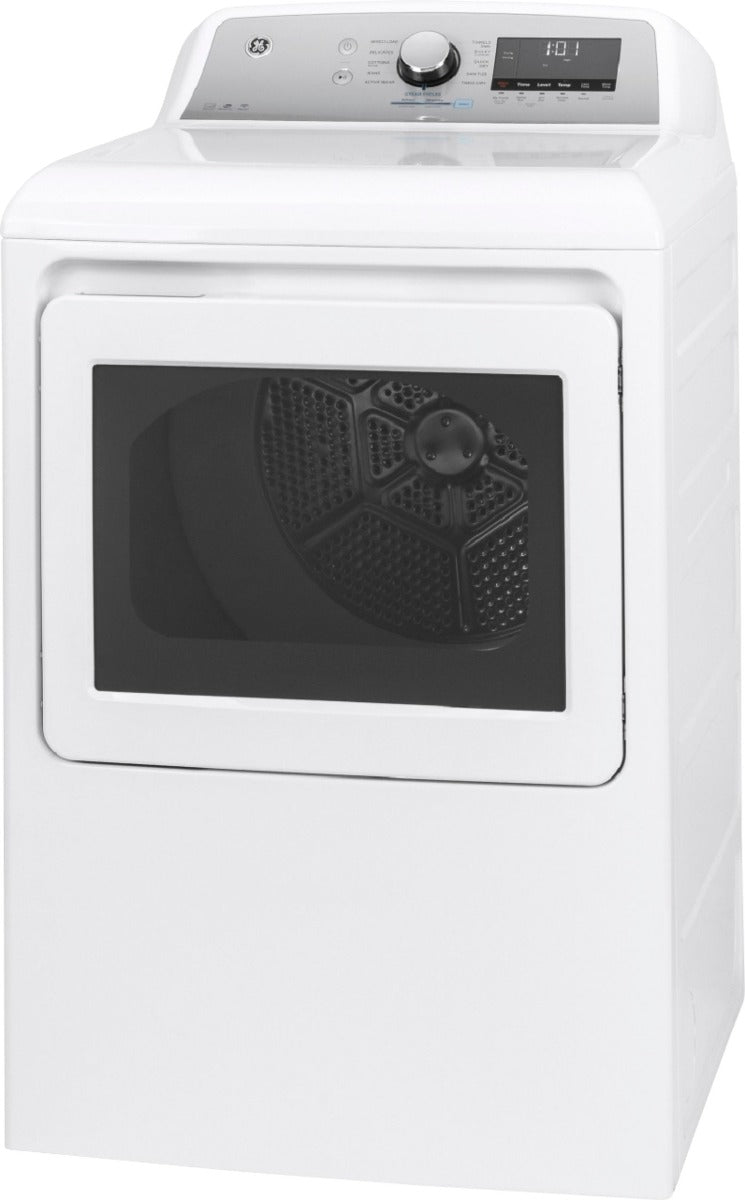 Create easier work of laundry chores with this front-load GE gas dryer. Its steam settings refresh lightly worn clothes to save you the time and expense of a complete cycle, and the HE moisture sensors prevent over drying. This 7.4 cu. ft. GE gas dryer has 13 cycles to handle a variety of loads.