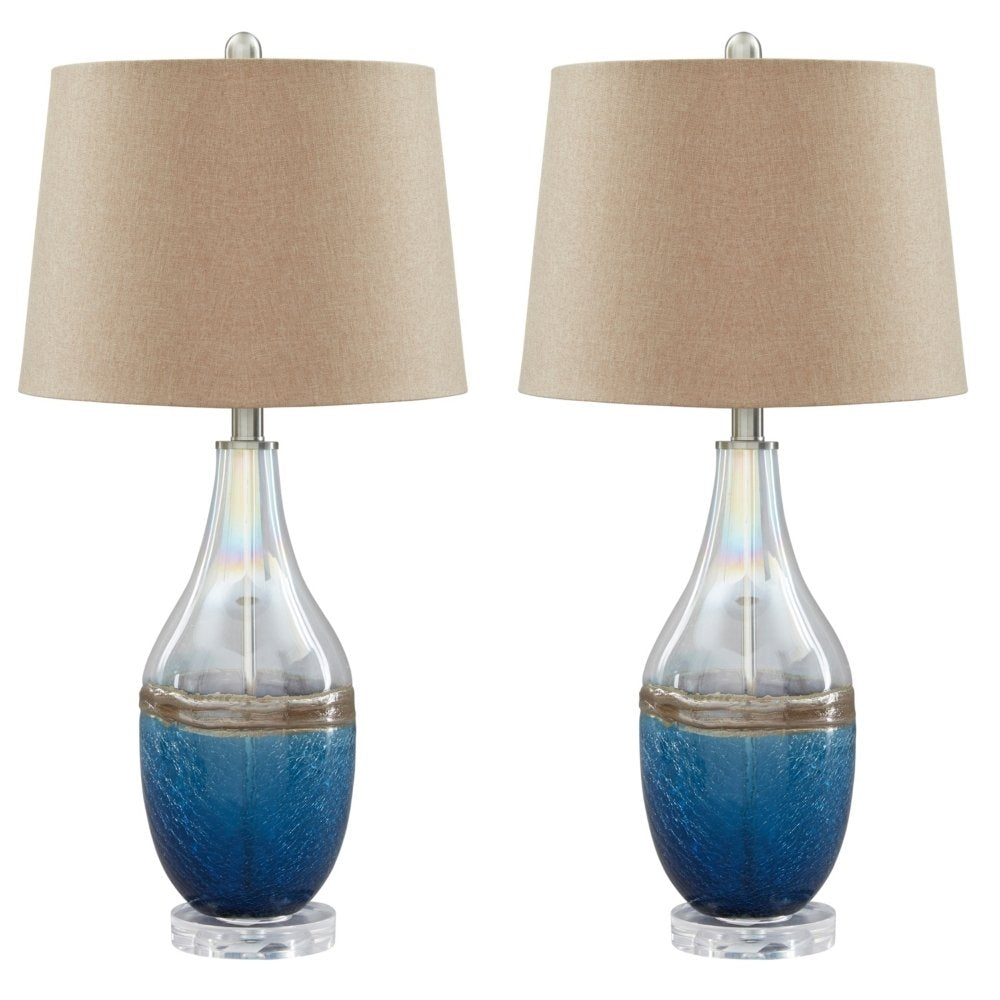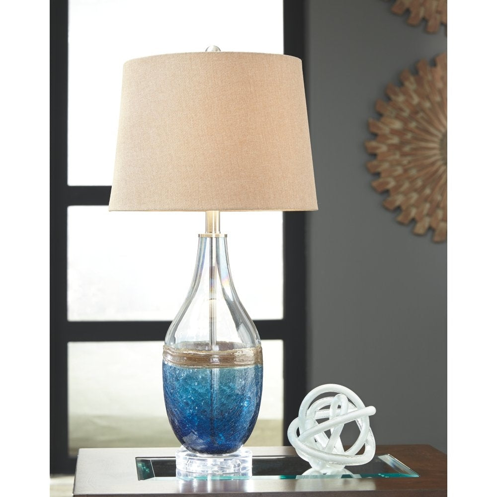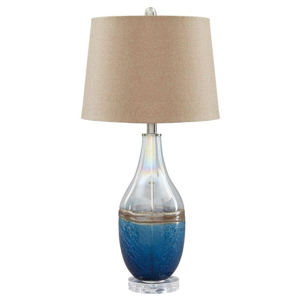 This table lamp embraces artful nautical living. Elements of the coast are reflected in the sea glass-inspired base. Textural ocean blue and sandy brown banding are reminiscent of where water meets land. At the right angle, light reflects a rainbow through the clear portion of the base. Tan drum shade completes the relaxing appeal.