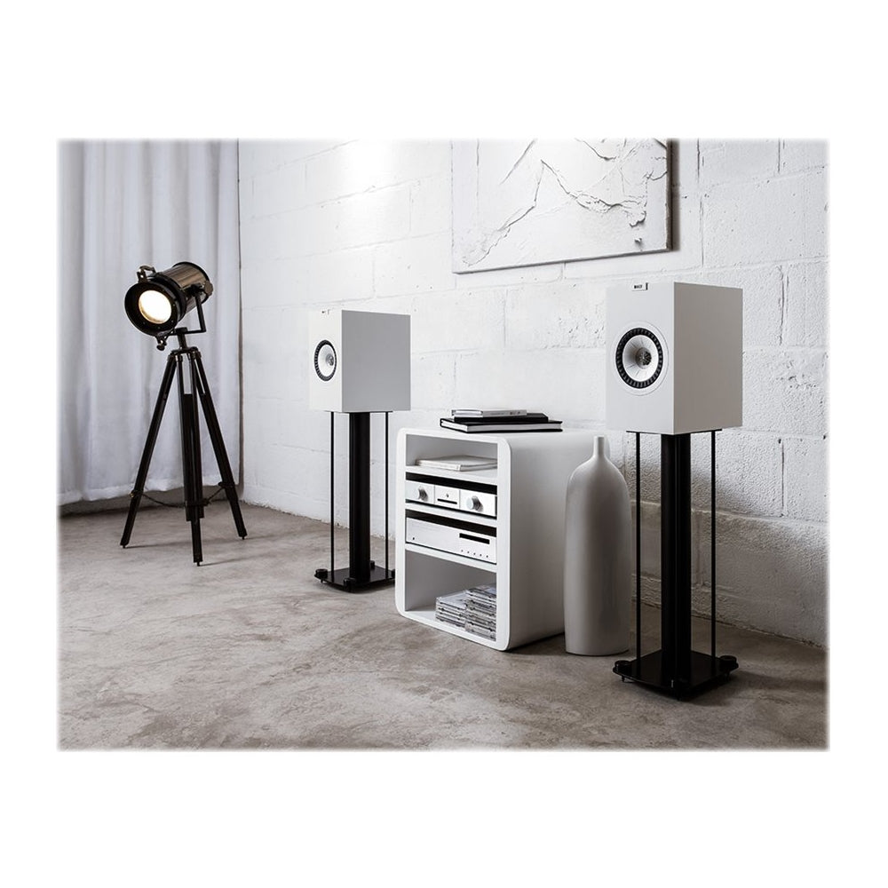 Generate big sound in your cozy entertainment space with these KEF bookshelf loudspeakers. Their Uni-Q driver array uses damped tweeter loading tubes to produce crystal-clear trebles and low-distortion inductors on the crossover for clean powerful bass. The fluid dynamic port design of these KEF bookshelf loudspeakers prevent midrange leakage for enhanced clarity.