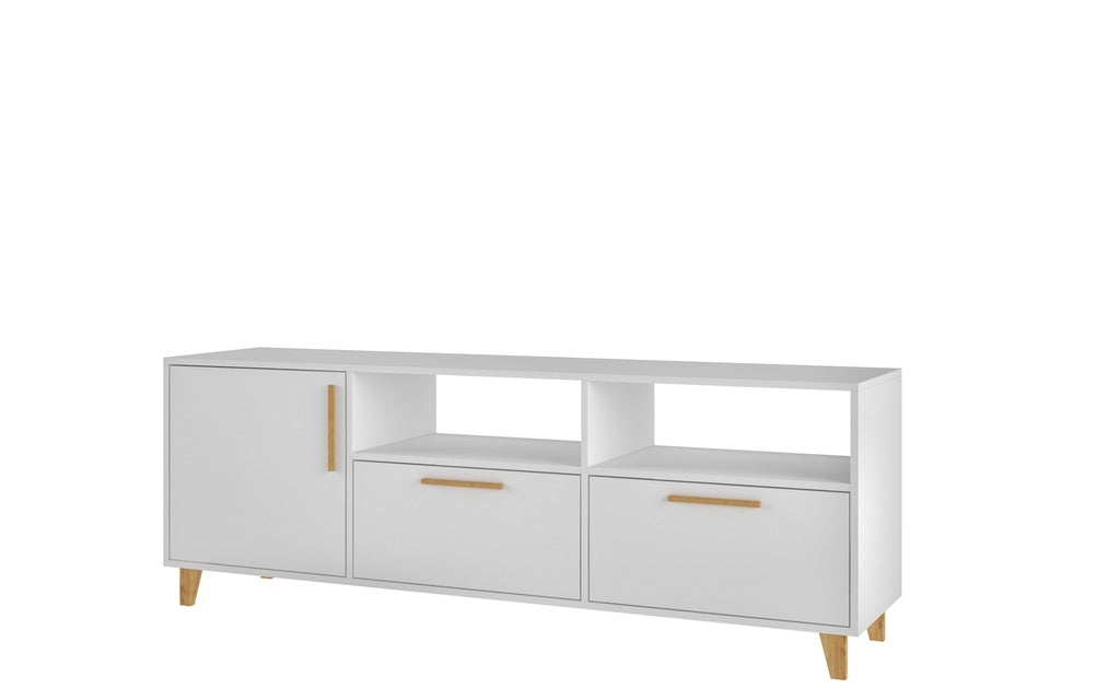 Invite your friends and family over for the greatest movie night in. The ultimate entertainment center without compromising on style or sophistication, the Herald TV stand is Mid Century Modern at its best with ample storage space for tucking away albums, all your media essentials, with plenty of concealed shelving and two elongated open shelves for displaying gaming consoles, DVD players, remotes, and more. Two lower shelves stay hidden behind sleek pull-down style doors and ensure all items stay organized.