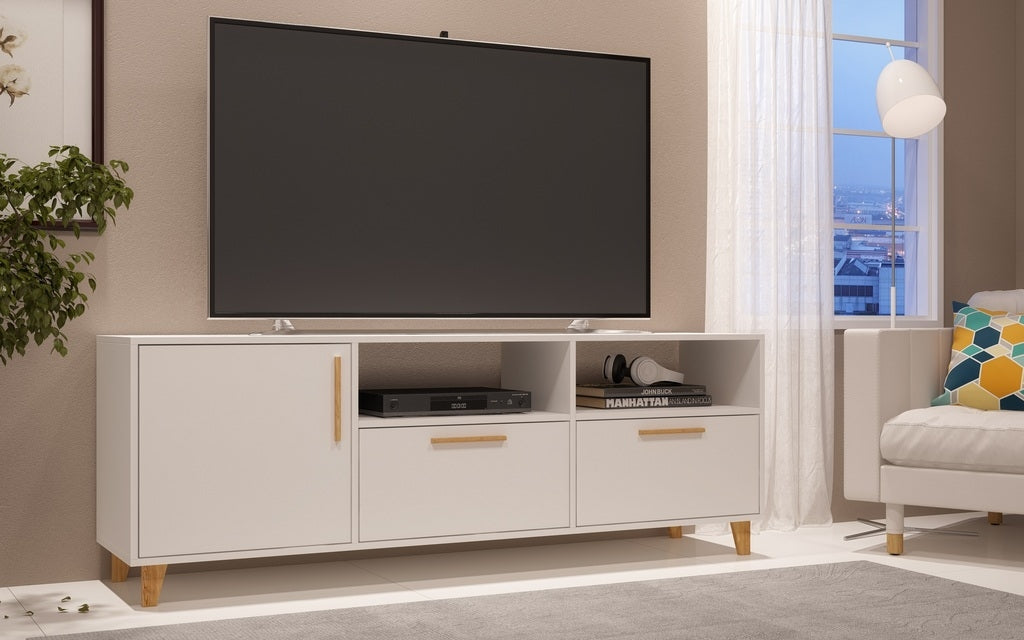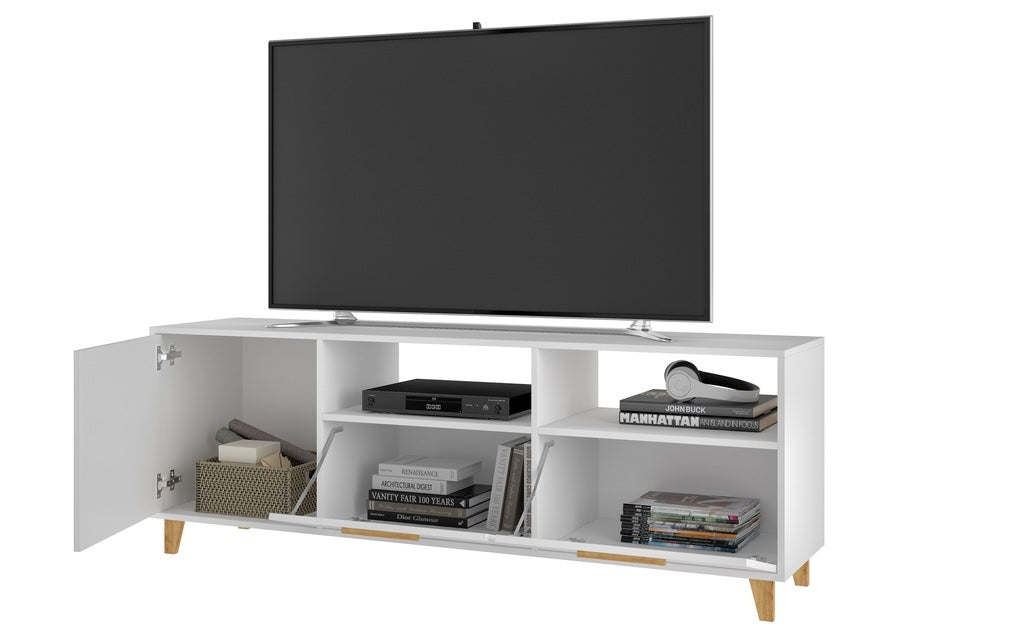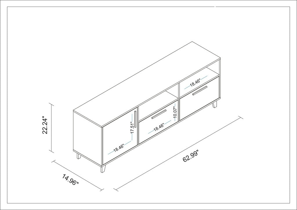 Free Standing Modern TV Stand for Living Room and Bedroom use. * Upon Assembly Measures: 53.15 in. Length, 24.61 in. Height, 13.98 in. Depth. * Recommended for a 42" - 50" TV. * Includes a total of 5 Shelving Spaces: 3 Conceals and 2 Open. * Side Door Conceals 1 Cubby Space, 2 Lower Shelves are Concealed with Pull Down Doors While Giving Outer Appearance of Drawers. * Features Long Solid Wood Door Handle Matching to Solid Wood Feet. * Interior Shelf Size: 18.46" Length. Bottom Concealed Spaces are 10.07" in Height, Open Spaces are 7.44" in Height. * Home Assembly Required. All Hardware Included.