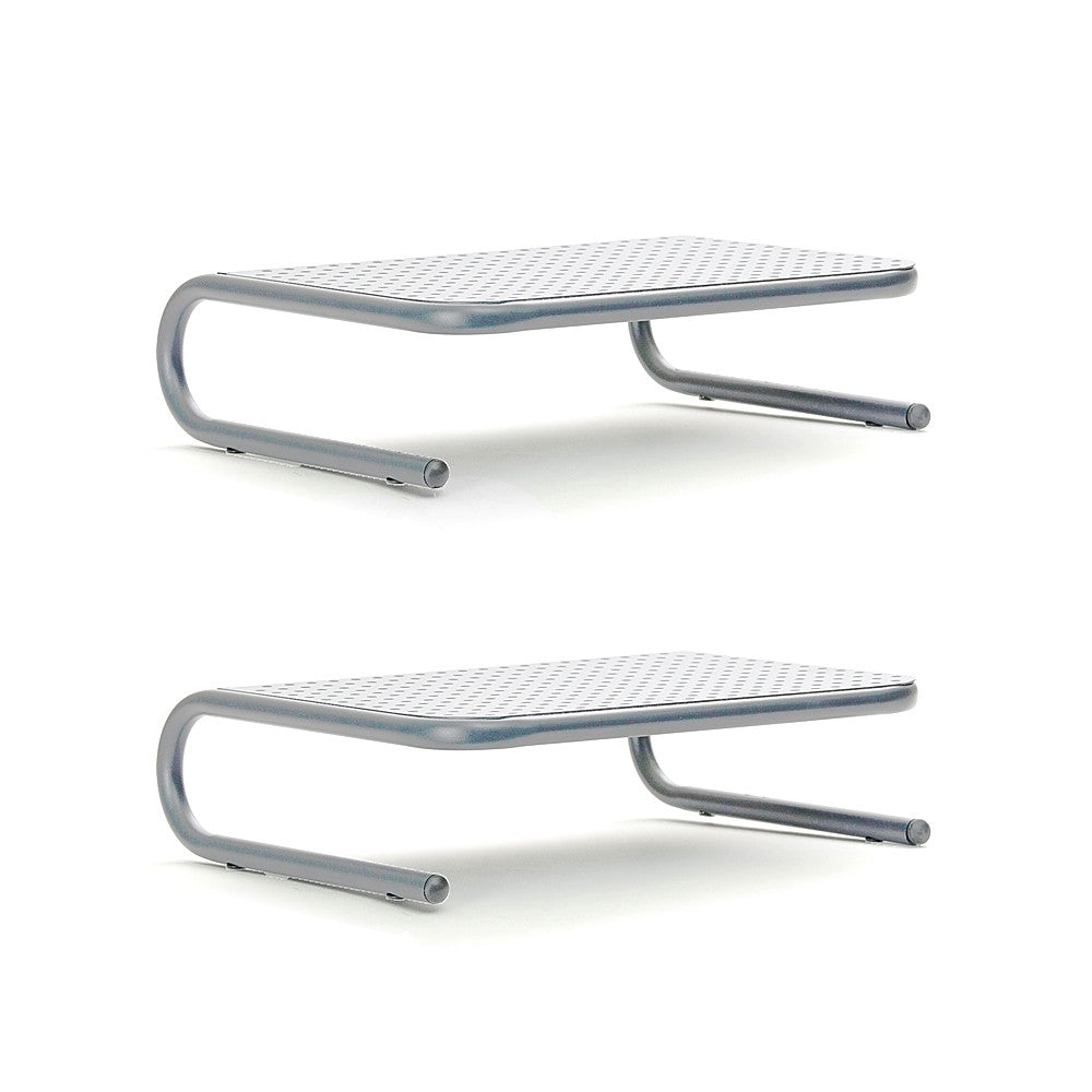 Instantly improve viewing and posture by raising computer monitors, flat screen tv or displays, laptops, printers, iMac Monitors, Desktops and more. Strong, durable and style, this set of 2 metal monitor stand pair holds up to 44lbs (20kg) each, fit most flat screen display monitors or televisions, laptops, printers and more, with ventilated metal mesh construction to prevent devices from overheating. Helping with STRESS AND NECK PAIN REDUCTION, each Erogonomically constructed riser lifts computer monitors, laptops and tv displays to a comfortable viewing position for more optimal viewing height and Improved neck position - helps to reduce back pain caused by poor posture while working. The NON-SLIP DESIGN offers rubber pads built into the monitor legs to reduce shifting of risers stands while sitting on table or desk surfaces - solid and sturdy metal vented construction is optimal for home and office use. PERFECT FOR HOME AND OFFICE USE - enjoy improved performance and work efficiencies with these monitor or tv stands while you work or watch tv - store keyboard and supplies under monitor riser - LED, LCD, OLED Flat Screen Displays, iMac, desktop PC and more. The ultimate SPACE SAVING and use VERSATILITY - Computer and monitor risers create additional storage on your desk, table or home entertainment furniture by raising your device off of the surface - store magazines, videos and more under stand riser. Gain additional ORGANIZATIONAL AND STORAGE efficiencies on your work desk or home office - add more desk surface by lifting your monitor up onto a desktop or tabletop stand - store pens, pencils and office supplies underneath. REDUCING EYE STRAIN is a common problem facing people who work in front of a screen all day. Creating an optimal work or entertainment viewing experience is critical for eye, neck and back strain - sitting at the recommended distance from your device will help to reduce pain due to poor posture. The ULTIMATE STUDENT MUST HAVE - The perfect addition to any dorm room - create a comfortable and safe study environment for hours of studying on computer or tablet device or for TV viewing with friends - THIS 2-pack for computer and tv is a must have for back to school supplies or gift for any student. Each Mind Reader mesh vented metal riser measures approximately 15"wide x 11"long x 3"high. Keep your monitor stand riser clean with damp cloth for long lasting use and storage as needed. No assembly required, simply open and remove from box and use immediately. Available in Black. Includes 2 monitor stand risers.
