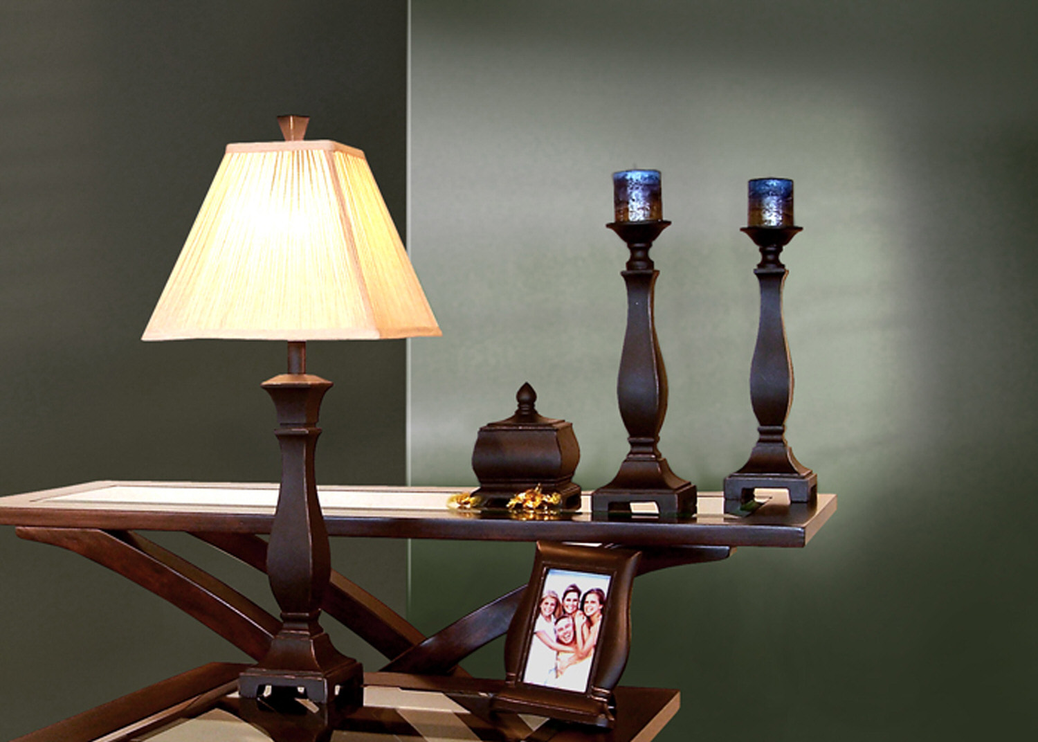Light up your life with this great 5 piece living room decor gift set . This set features a beautiful transitional style table lamp with a classic pleated beige shade complete with a filial on top, treasure box, a 4x6" photo frame and two matching candle holders all in a antique bronze finish that will transform any interior design. This makes an ideal gift set for a house warming or give to yourself to update your current living room decor.