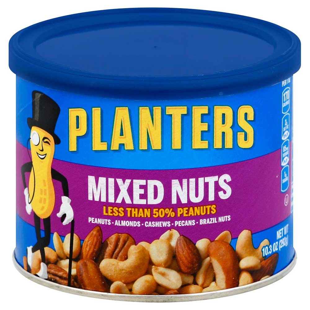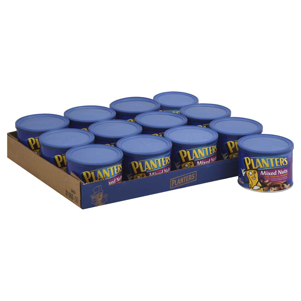 The Planters Mixed Nuts are a nutritious on-the-go snack suitable for all age groups. Flavored with sea salt, these nutrient-rich mixed nuts contain peanuts, almonds, cashews, hazelnuts, and pecans. Available in 10.3-ounce cans, this bulk pack of Planters mixed nuts is great for convenience stores, retail stores, and supermarkets.