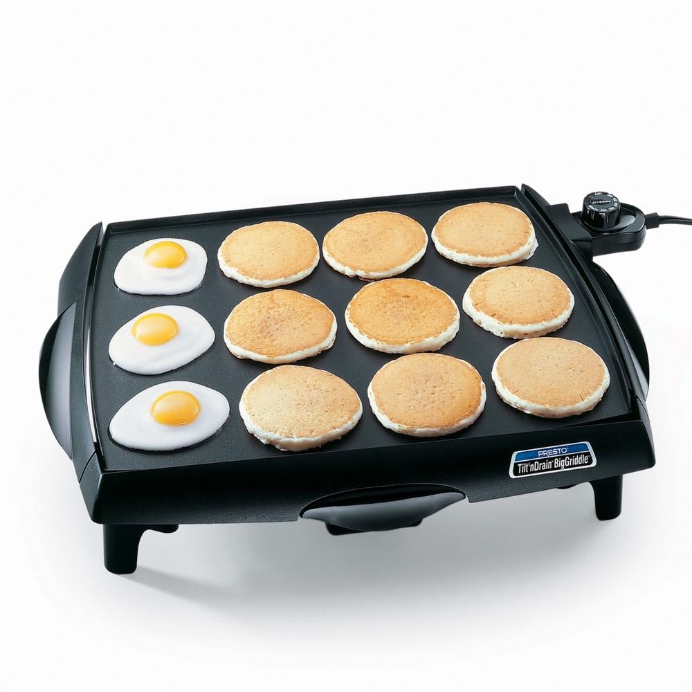 Cooks up to 50% more food than other jumbo griddles. Exclusive Tilt?nDrain feature, too! This griddle features a huge cooking surface for making up to 50% more food than other jumbo griddles ? as many as 12 slices of french toast at one time. Control Master heat control maintains the proper cooking temperature automatically. Fully immersible and dishwasher safe with the heat control removed.