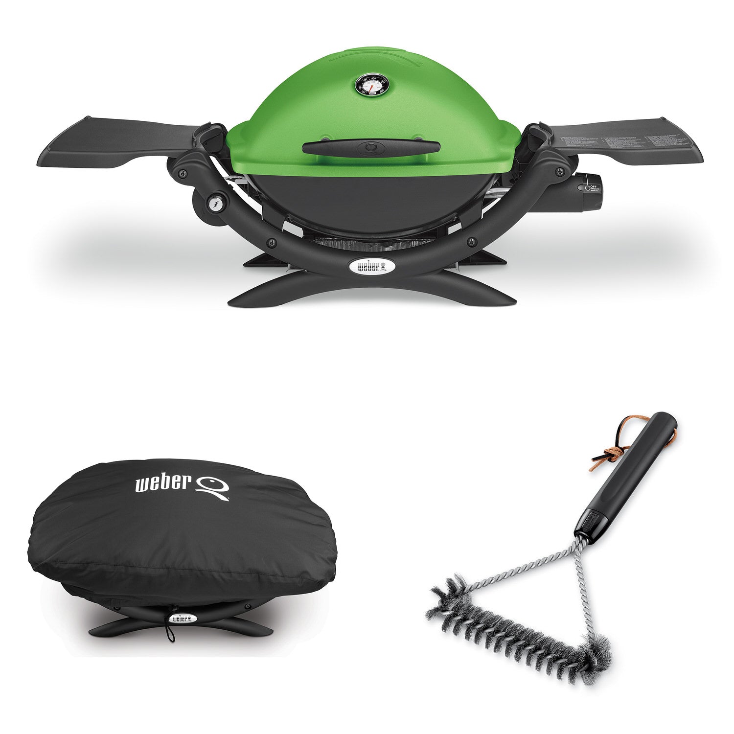 The Weber Q1200 gas grill is lightweight (24 lbs) and packs plenty of power. Perfect for camping and tailgating. Features a high-performance cooking system (8,500 BTU-ph/input), 189 sq. in. total cooking area, electronic ignition for reliable lighting and an infinitely adjustable burner valve with high-quality regulator. Cast-aluminum lid & body, large weather-resistant lid handle, porcelain-enameled cast-iron cooking grates, and 2 durable, tuck-away work tables. Removable drip tray allows for easy clean up. Std 14.1 oz LP cylinder (sold separately). Kit includes a Weber 2-piece Stainless Steel Tool Set and a 12'', Weber 3-Sided Grill Brush for keeping grill grates clean of food debris.